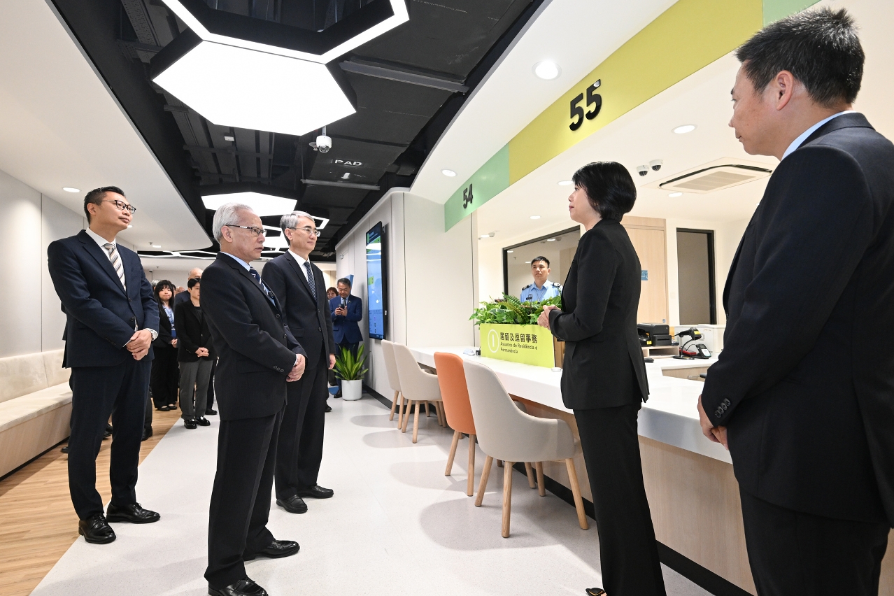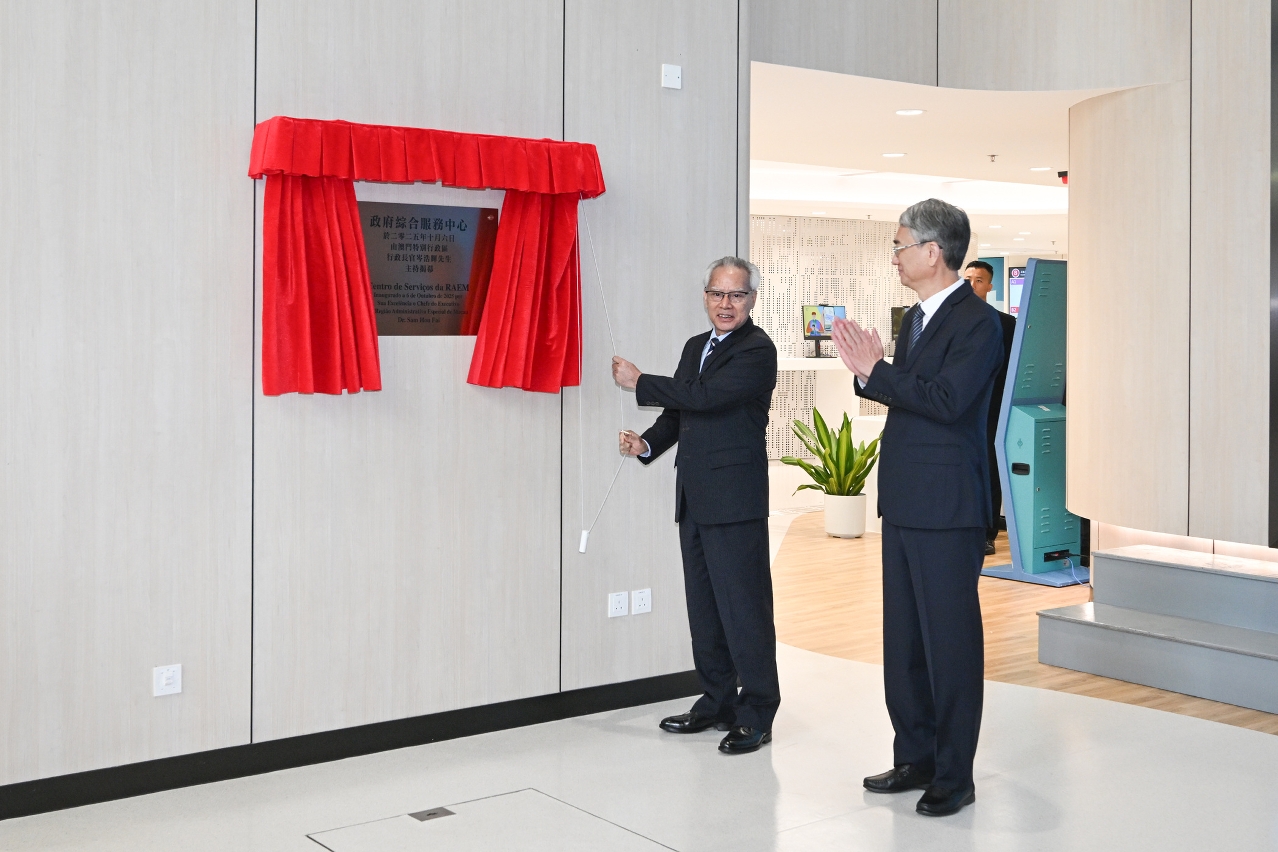 O Chefe do Executivo, Sam Hou Fai, acompanhado pelo Secretário para a Administração e Justiça, Cheong Weng Chon, presidiu à cerimónia de descerramento da placa do Centro de Serviços da RAEM na Avenida de Venceslau de Morais, visitou o Centro de Serviços, e ouviu a apresentação dos dirigentes e chefias, bem como os trabalhadores do Departamento destacados no Centro.