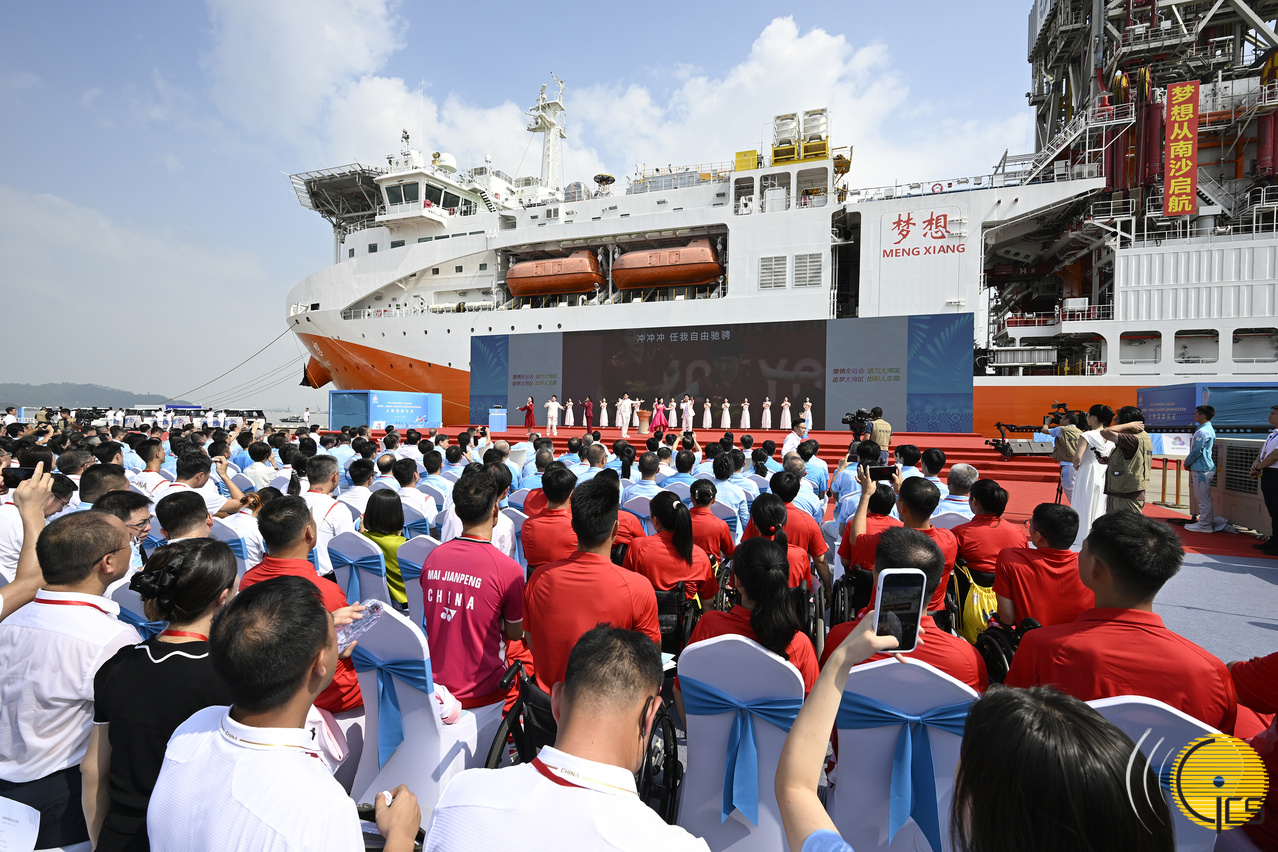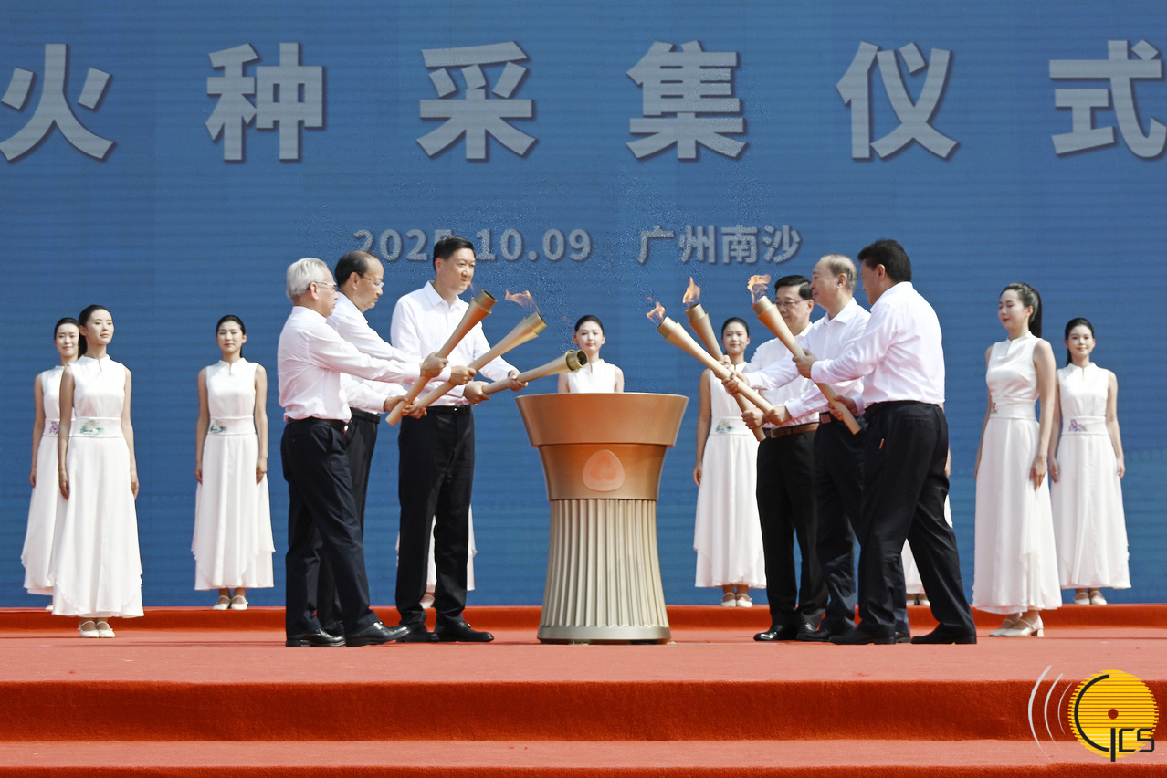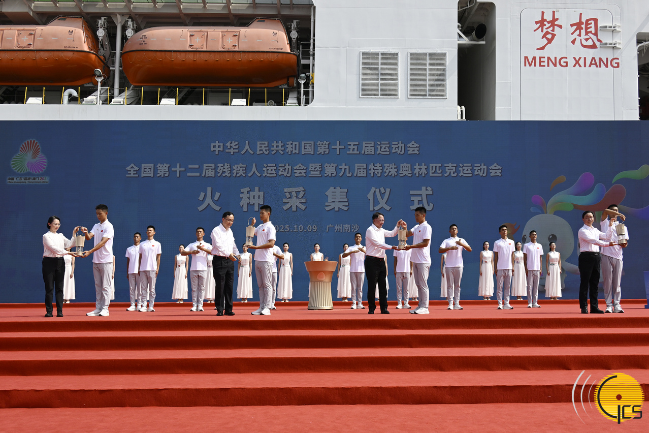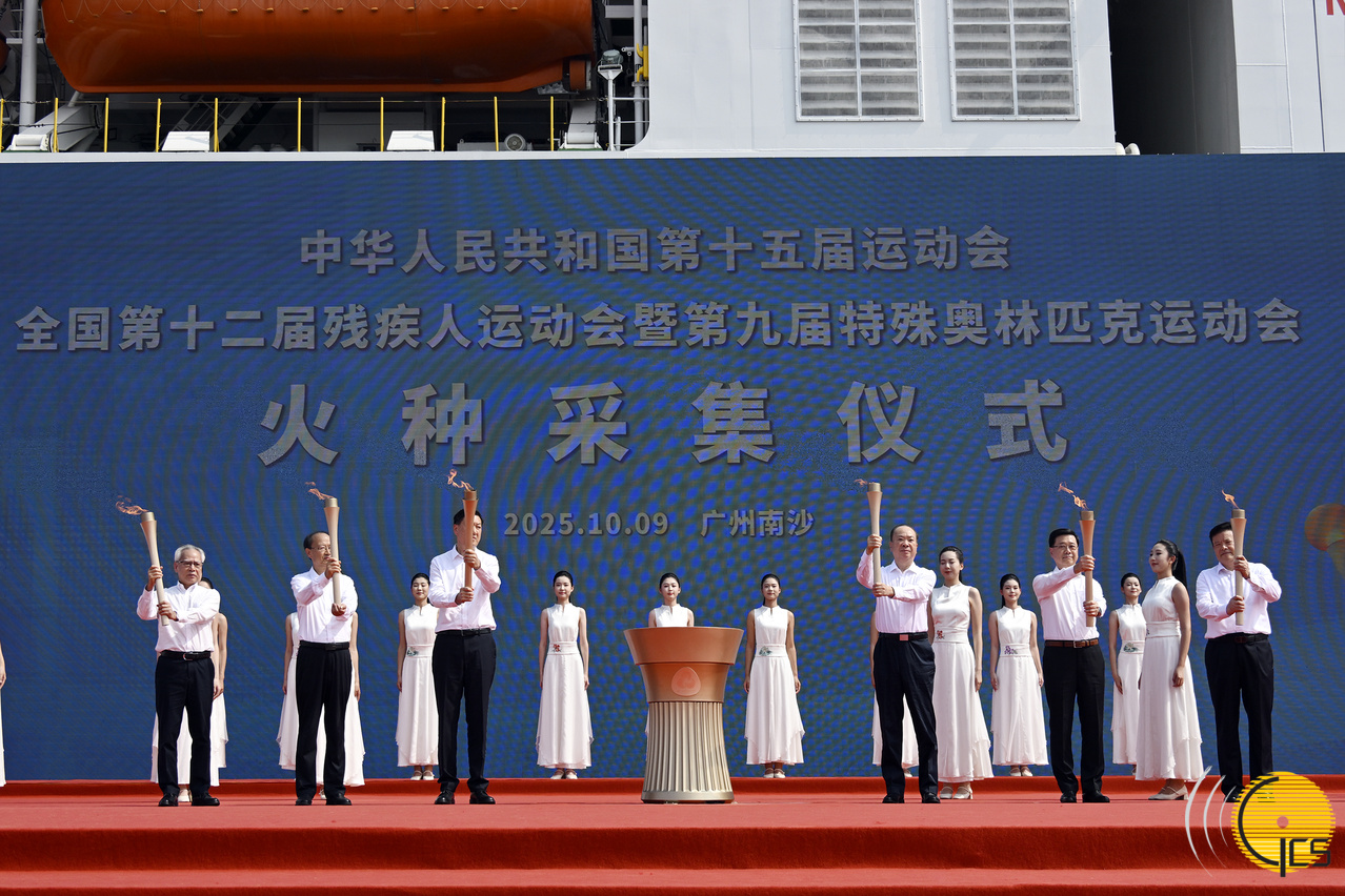 No dia 9 de Outubro, na presença do primeiro navio de perfuração oceânica projectado e construído autonomamente pela China “Mengxiang”, a cerimónia de acendimento da chama da 15.ª edição dos Jogos Nacionais e da 12.ª edição dos Jogos Nacionais para Pessoas Portadoras de Deficiência e 9.ª edição dos Jogos Olímpicos Especiais Nacionais (adiante designada por 15.ª edição dos Jogos Nacionais e Jogos Olímpicos Especiais para Deficientes) teve lugar em Nansha da Cidade de Cantão.