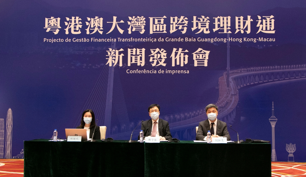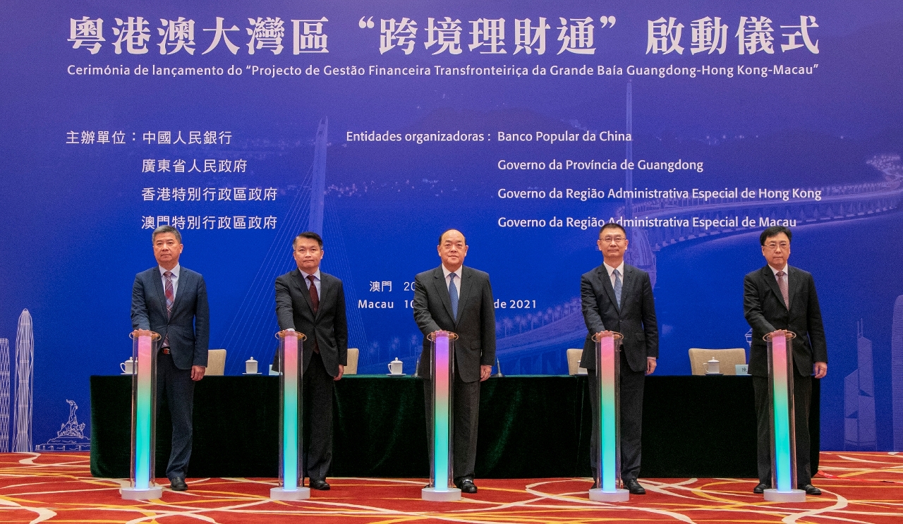 中国人民银行、广东省人民政府、香港特别行政区政府与澳门特别行政区政府,今(10)日共同视频连线举办了“粤港澳大湾区跨境理财通启动仪式”。人民银行副行长潘功胜、国务院港澳事务办公室副主任黄柳权、广东省省长马兴瑞、香港特别行政区行政长官林郑月娥,以及澳门特别行政区行政长官贺一诚在启动仪式上致辞。中央人民政府驻澳门特别行政区联络办公室副主任姚坚、澳门经济财政司司长李伟农、澳门金融管理局行政管理委员会主席陈守信及委员黄立峰陪同出席启动仪式。