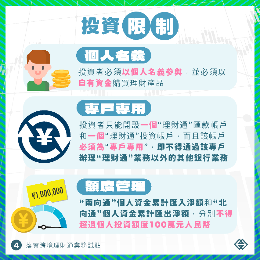 “跨境理财通”的投资者必须以个人名义参与,并以自有资金购买理财产品。“北向通”与“南向通”各自设置总额度管理,每名投资者投资额度为100万元人民币。澳门投资者通过“北向通”由澳门汇出至内地的资金,不会纳入个人向内地同名银行帐户的每人每天汇款限额管理。