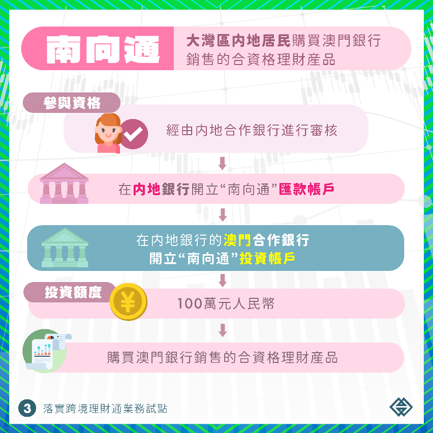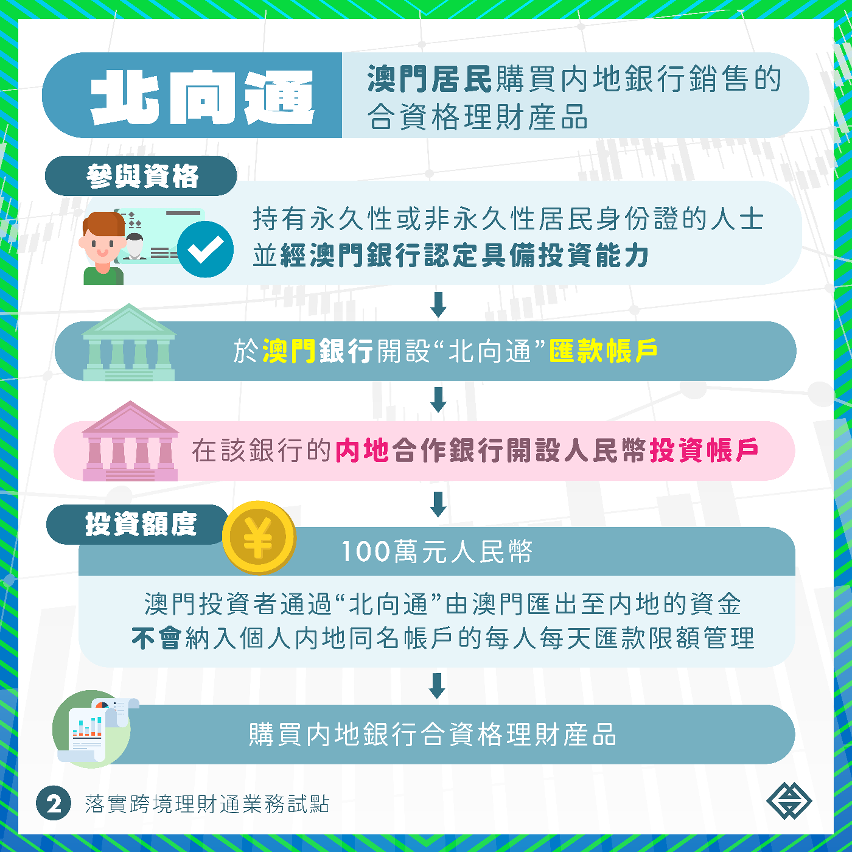 澳门居民可于澳门银行开设“北向通”汇款帐户,并在该银行的内地合作银行开立人民币投资帐户,以购买经内地银行销售的合资格理财产品。大湾区内地居民则可在内地银行开立“南向通”汇款帐户及在该内地银行的澳门合作银行开立投资帐户,以购买澳门银行销售的合资格理财产品。