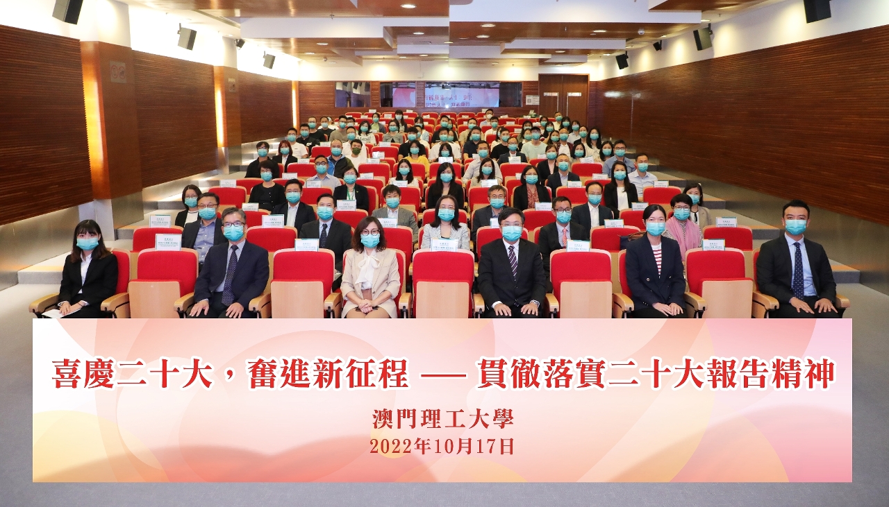 中国共产党第二十次全国代表大会10月16日上午在北京人民大会堂隆重开幕,澳门理工大学师生观看二十大开幕会直播,认真聆听习近平总书记作的报告。2022年10月17日,澳门理工大学举办“喜庆二十大,奋进新征程——贯彻落实二十大报告精神” 学习会,师生校友深入讨论报告内容,分享学习成果。行政管理委员会全体成员、各院院长、学术单位主管、行政部门主管、教师、行政人员、学生会、校友会代表近百人,相聚在汇智楼演讲厅,认真学习二十大报告,场面热烈。