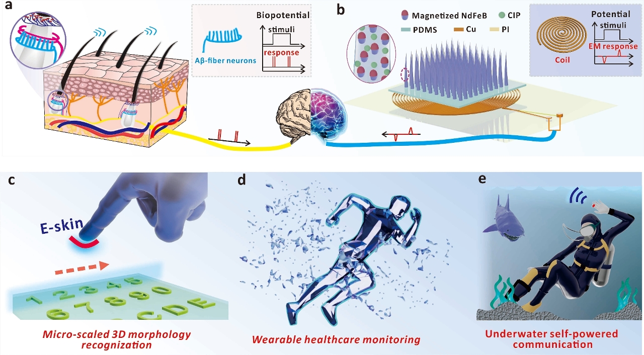 受人体皮肤的启发,研究团队设计出由毛发状磁化微纤毛阵列(MMCA)和柔性线圈组成的电子皮肤系统。得益于MMCA内置的对齐磁矩,外界机械刺激所带来的的微纤毛形变能够在导电线圈中产生相应的电压信号,从而实现对外部压力及表面形貌的反馈。该工作系统研究了电压强度与压力的内在联系,并探讨如何设计MMCA以优化电压信号的强度和波形来定量反馈表面形貌的三维信息。此外,通过调控MMCA内置的磁矩排列,该电子皮肤亦可在单一器件上输出多种电压波形作为信息编码,用于高效人机交互和大容量信息传输。由于该电子皮肤的工作原理是电磁感应现象,因而能在高温、水下等不同环境中以自供电的方式实现稳定工作。相关论文综合展示了该电子皮肤在穿戴式健康检测(包括呼吸状态、关节弯曲感知等)、盲文识别与浮雕信息重塑、大容量指令传输、水下摩斯密码通信等多方面的应用优势。