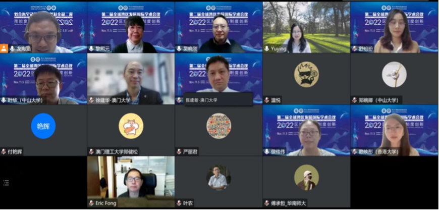 会议围绕“区域合作与制度创新”主题,设置了“香港分会场”和“经济分论坛”、“社会分论坛”、“传播分论坛”、“政治分论坛”、“法律分论坛”5个分论坛,上午的大会开幕式和主题报告环节以中英双语进行网络直播。在下午的“香港分会场”和5个分论坛中,与会专家们围绕分论坛议题作了专题报告,对粤港澳大湾区的经济合作与产业发展、制度建设与区域治理、国际传播与文化融合等方面进行了深入探讨。来自旧金山湾区、东京湾区和粤港澳大湾区的专家学者分享交流全球湾区发展的学术前沿与实践经验。其中,澳大社会科学学院讲座教授赵心树作《从粤港澳大湾区十一城市的品牌效应看选择螺旋中的议程协调》主题报告。