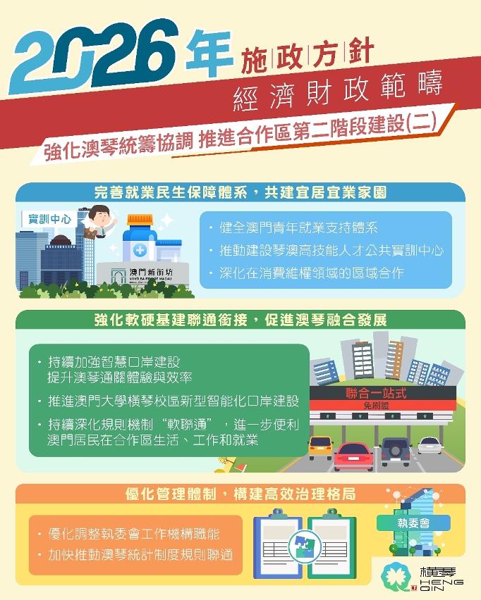 为深化对横琴粤澳深度合作区(下称“合作区”)发展建设的参与,澳门特区政府于2025年成立“促进横琴粤澳深度合作区建设领导小组”,过去一年推动合作区建设取得实质性进展和成效。澳门特区政府日前已正式公布2026年施政报告,指出将加强统筹协调,抓紧重点工作,紧扣“澳门+横琴”的战略新定位,以澳琴一体化为目标推进合作区第二阶段建设。