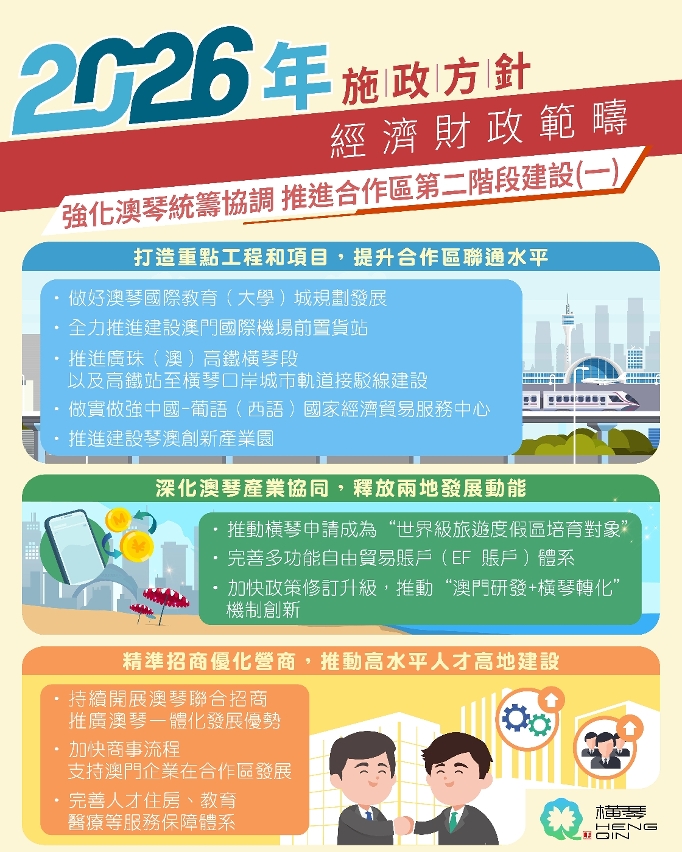 在重点工程和项目方面,2026年将重点做好澳琴国际教育(大学)城一期的各项筹备工作,全力推进澳门国际机场前置货站项目建设,推进广珠(澳)高铁横琴段以及高铁站至横琴口岸城市轨道接驳线建设。做实做强中国—葡语(西语)国家经济贸易服务中心,推进琴澳创新产业园建设。