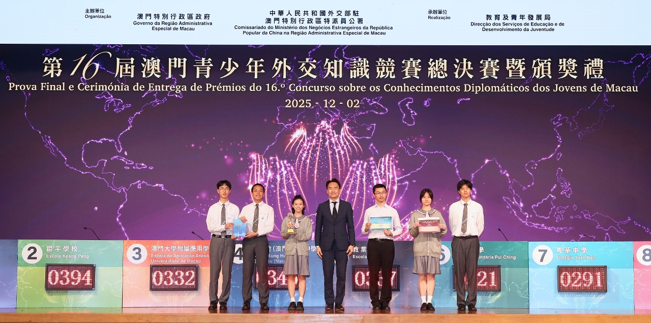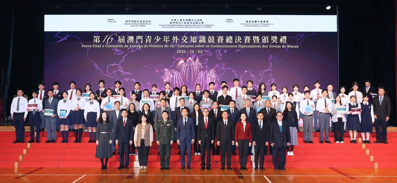 由澳门特别行政区政府与中华人民共和国外交部驻澳门特别行政区特派员公署主办、教育及青年发展局承办的第16届澳门青少年外交知识竞赛总决赛暨颁奖礼于12月2日举行。竞赛综合考验参赛学生对习近平外交思想、中国特色大国外交、涉澳外交、外交史、外交常识、时政热点等的掌握和运用,得到特区社会各界广泛支持。本届参与的学校共37所,学生人数超过 9,000人,由推广赛、初赛到脱颖而出进入总决赛的8支队伍,经过一轮紧张的外交知识较量,最终由镜平学校获得冠军,濠江中学、圣公会(澳门)蔡高中学、教业中学分别获亚军、季军和殿军,澳门大学附属应用学校、培正中学、劳校中学、粤华中学获优异奖。
