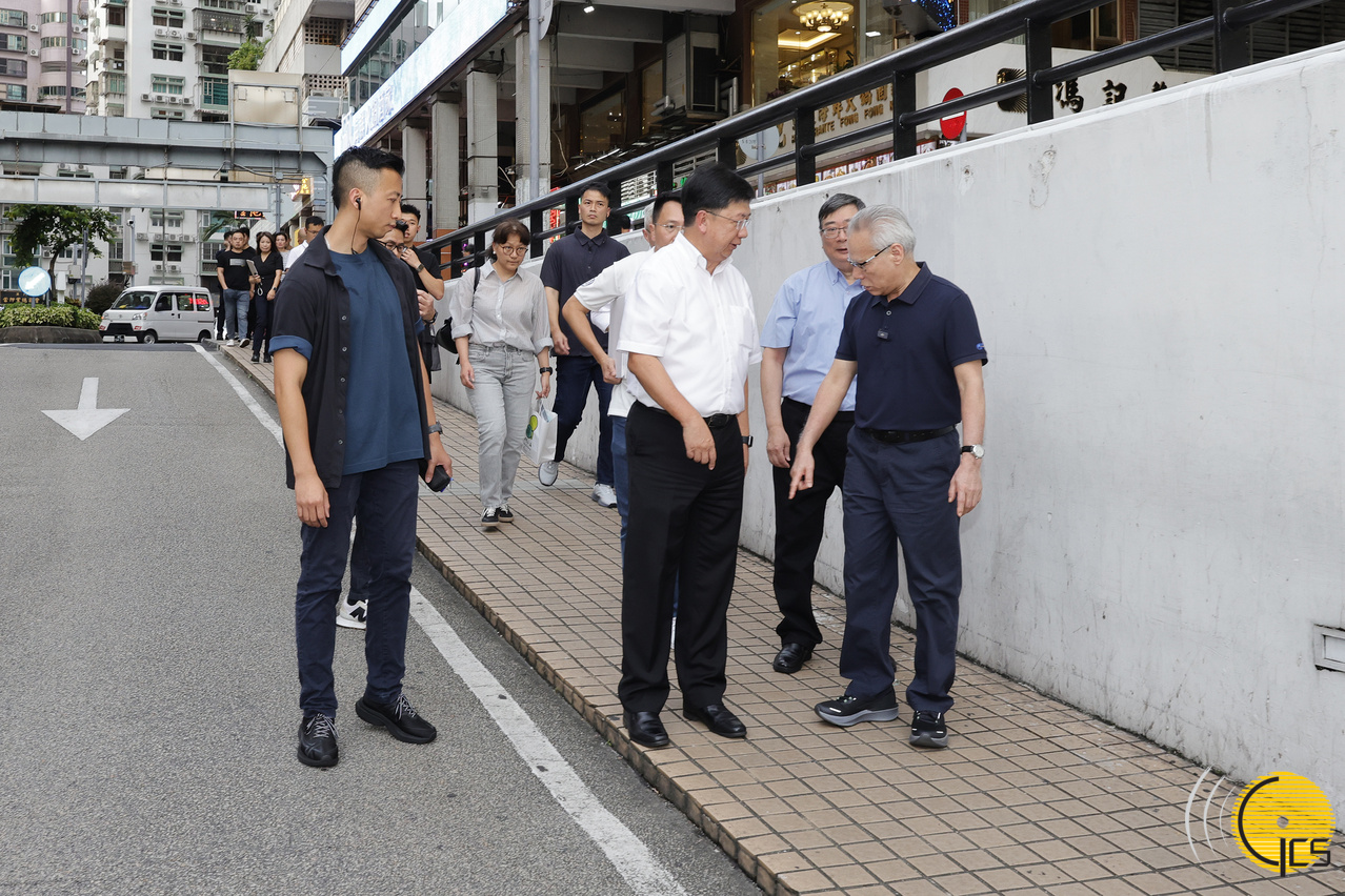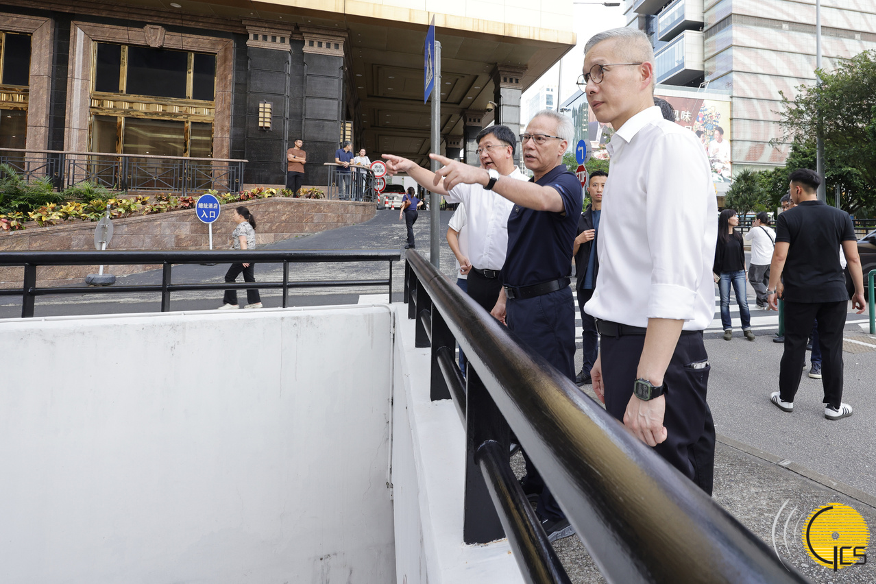 其后,岑浩辉步行至靠近市集的友谊大马路一侧视察,听取运输工务司司长谭伟文介绍优化新口岸周边道路设施的构思,包括便利行人横过友谊大马路的完善措施。一行随后经附近的公共停车场前往皇朝区,沿途视察了解新口岸区周边的停车条件,以及徒步通行新口岸和皇朝区之间的现况。
