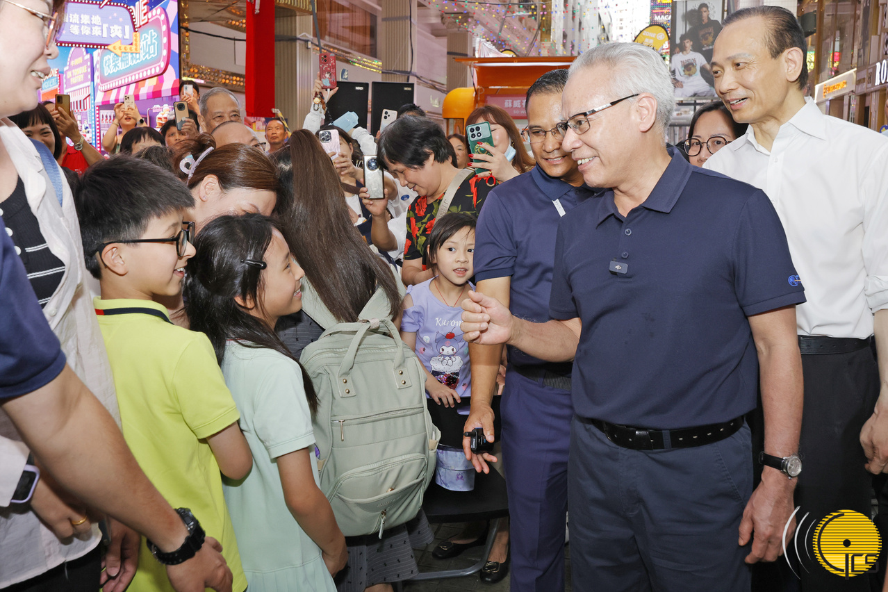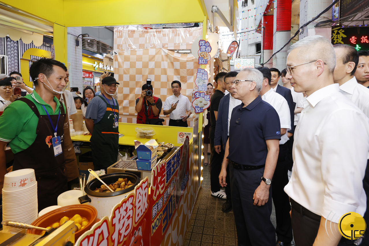 “寻味新口岸市集”自8月15日起一连十天在新口岸广州街及上海街举行。岑浩辉下午在经济财政司司长戴建业陪同下,实地了解市集在假日的引流情况,期间与包括新口岸商户在内的摊位经营者交流,借此总结活动经验,并参考持份者意见,想方设法推动该区经济发展。走访市集期间,他购买了澳门文创商品,支持本地消费。此外,他不时与到访市集的居民和旅客亲切互动,共享活动的热闹气氛。