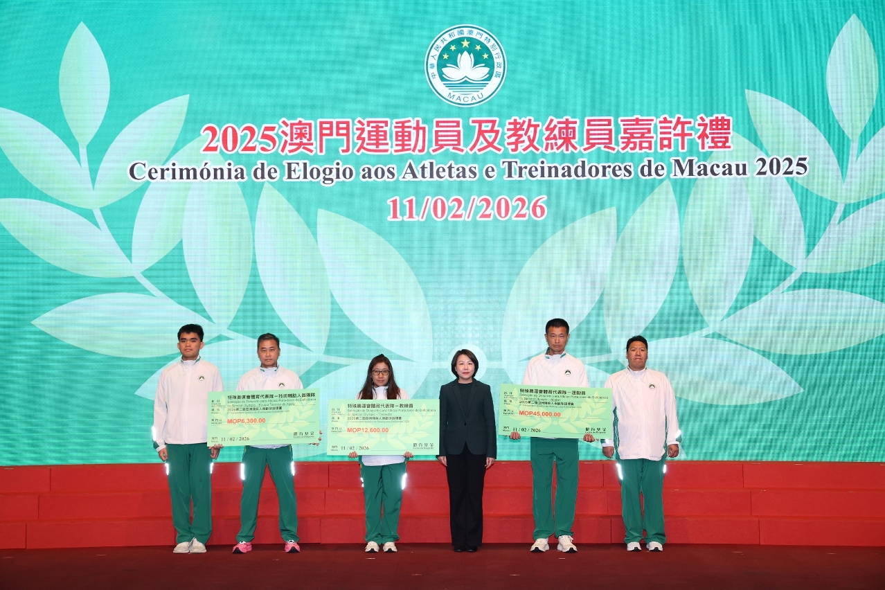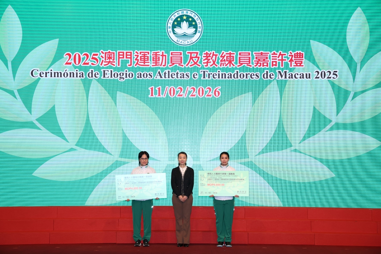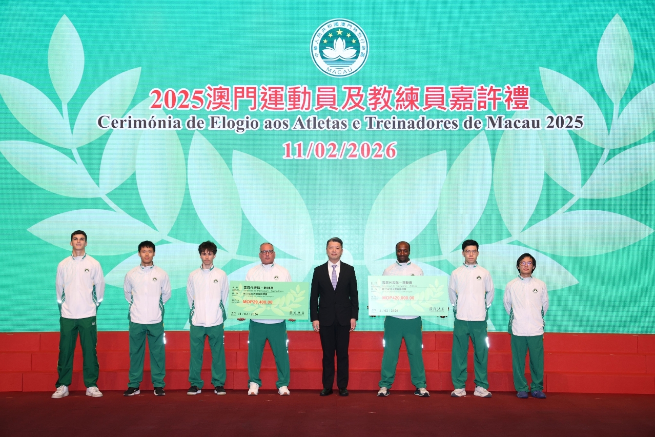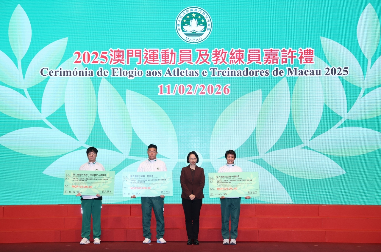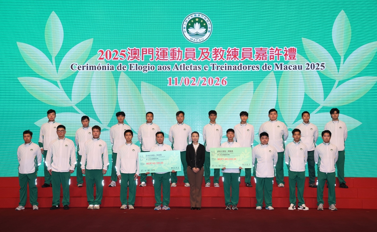 为表彰在2025年度参加体育比赛中获得优秀成绩的本澳运动员、教练员及技术辅助人员,以及为鼓励澳门体育代表团在今年各项大型体育赛事中创造佳绩,「2025澳门运动员及教练员嘉许礼暨2026体育代表团誓师仪式」昨(11)日晚上七时半举行,社会文化司司长柯岚等出席仪式,勉励并祝贺一众运动健儿。