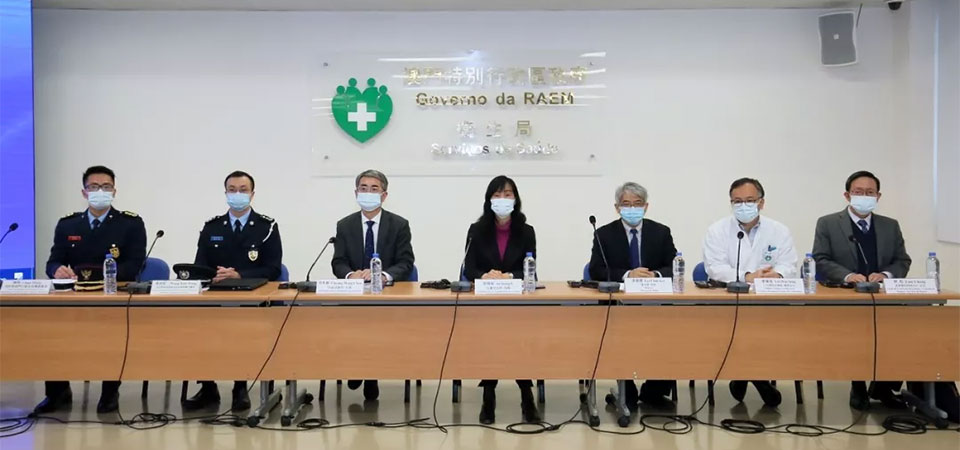 澳門社會文化司歐陽瑜司長、行政法務司張永春司長、衛生局李展潤局長、仁伯爵綜合醫院李偉成醫務主任、疾病預防控制中心林松主任、治安警察局居留及逗留事務廳代廳長黃劍虹副警務總長、消防局行動及救護處處長陳明共同會見傳媒。