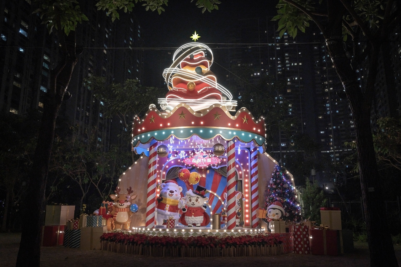 當中於議事亭前地除佈置大型燈光隧道外,還安裝了一組色彩繽紛的大型聖誕樹,以金色蝴蝶結為主軸,堆疊各式各樣彩球;樹兩旁以旋轉樓梯作點綴,周邊配置禮物盒、彩球以及造型可愛的聖誕老人及小精靈,增添了趣味和節慶感。另外,於澳門科學館亦可見到聖誕老人乘坐太空船降落的座地燈飾;氹仔中央公園則配置了多個造型可愛聖誕角色的聖誕樹、各類燈光裝置及聖誕吊飾;運動場圓形地以遊樂園為主題,透過聖誕老人、雪人、薑餅人等,傳遞歡樂溫馨的氣氛。