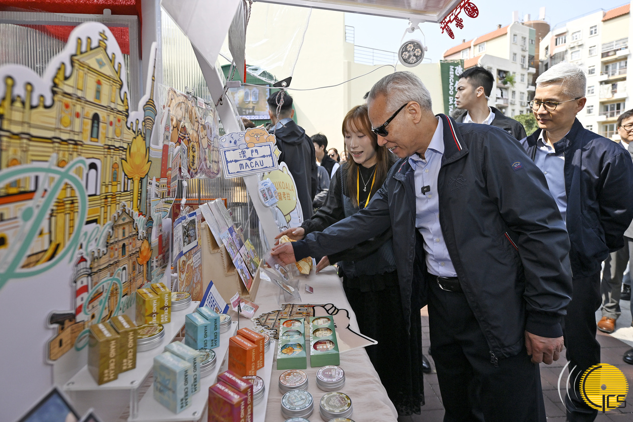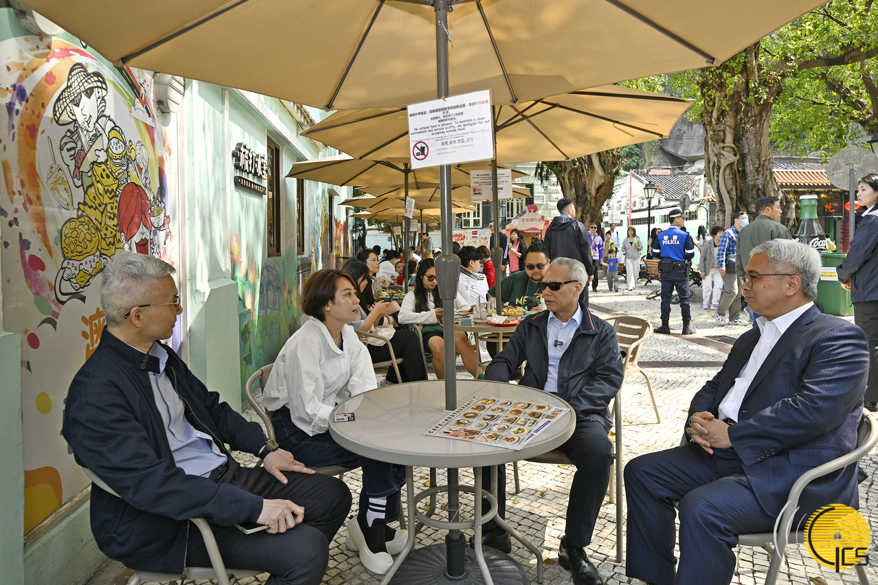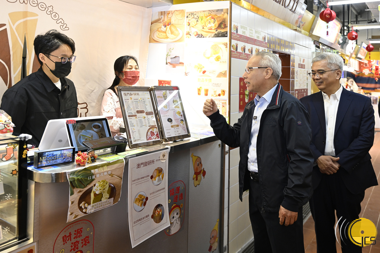 岑浩輝隨後轉往氹仔,在行政法務司司長黃少澤陪同下,視察經整治優化後的氹仔街市。他與檔主親切交談,瞭解新環境對日常經營帶來的改善與效益;他又到訪街市內新設的“美食+文創區”,聽取有關推動傳統街市轉型和可持續發展措施的介紹。岑浩輝其後與戴建業探訪氹仔舊城區一帶的商戶,瞭解新春期間和平日的營商狀況。
