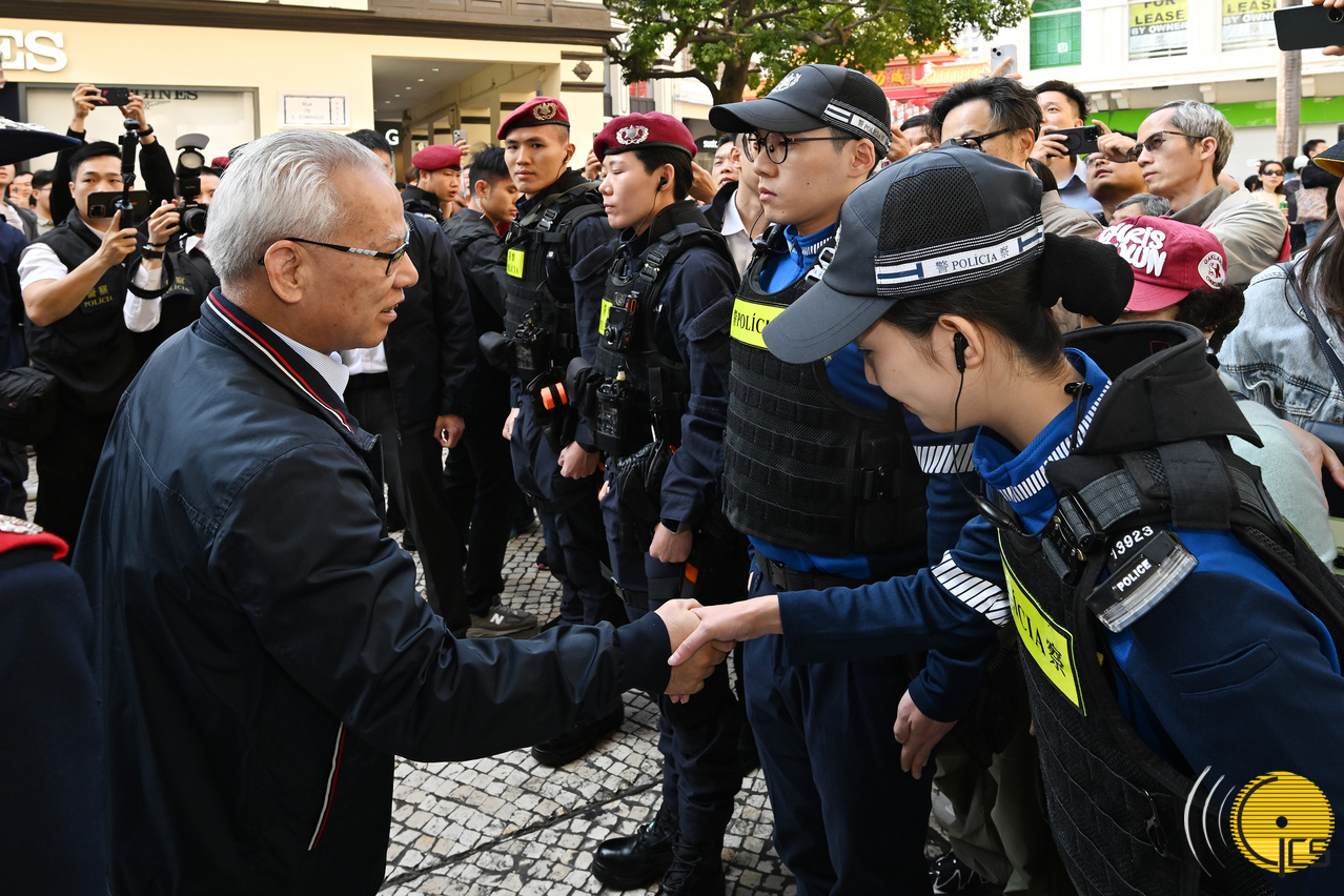 上午,岑浩輝在經濟財政司司長戴建業、保安司司長陳子勁、警察總局局長梁文昌及海關關長何浩瀚等陪同下,先後視察大三巴街、賣草地街、板樟堂街及議事亭前地一帶,聽取有關人潮管制措施的應變部署,並慰問現場執勤的前線警員,感謝他們在節日期間堅守崗位、辛勤付出。他表示,警方在人潮管制方面經驗豐富,相關措施行之有效,配合整體警務安排,有效確保市民及旅客在澳安心歡度佳節。