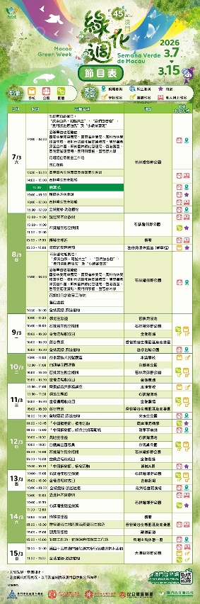 本屆綠化週於3月7日至15日一連九日舉行,期間將舉辦超過四十場自然主題活動,包括全新的“石排灣生態全接觸”活動,帶領公眾參觀兩棲爬蟲館、觀鳥園及蝴蝶園三個新增的設施。其他活動還包括大潭山郊野公園的大步行及護理林木活動、橫琴生態遊、濕地生態遊、觀鳥生態遊、金像農場收成日、派送植物、植樹活動、“中國植樹節”紀念封加蓋郵戳等,並豁免松山纜車及黑沙越野車場小童車的收費。活動詳情可瀏覽市政署網頁www.iam.gov.mo、澳門自然網www.iam.gov.mo/nature或致電2833 7676、2888 0087查詢。