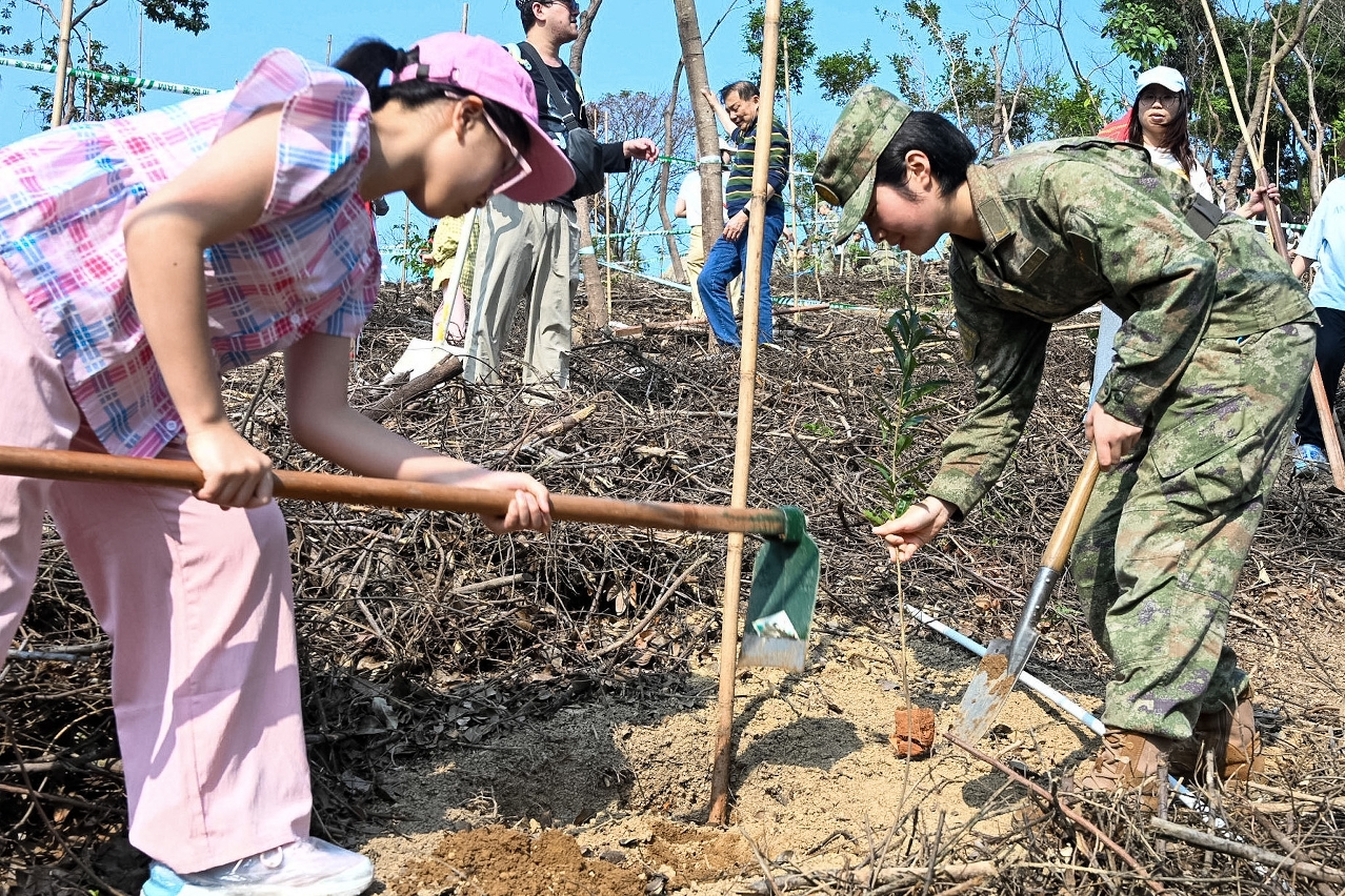 一眾嘉賓於開幕禮後參觀同場舉辦的綠化週嘉年華,了解由廣州、深圳、橫琴粵澳深度合作區、蘇州、香港及澳門多個機構和團體設立的生態保育主題攤位和工作坊,並參觀石排灣郊野公園新設的兩棲爬蟲館、觀鳥園及蝴蝶園。同時,逾百名駐澳部隊官兵及市民共同前往附近山林,合力護理樹木,為澳門的自然生態可持續發展貢獻力量。