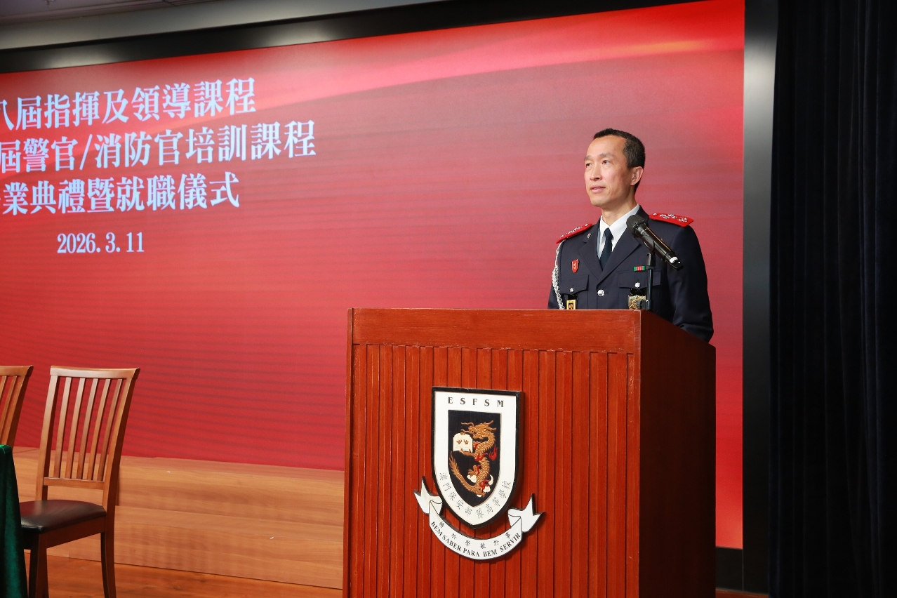 3月11日上午,澳門保安部隊高等學校(下稱“保安高校”) 舉行“第八屆指揮及領導課程及第十八屆警官/消防官培訓課程畢業典禮暨就職儀式”。典禮由保安司司長陳子勁主禮,中聯辦警聯部部長王前進、警察總局局長梁文昌、澳門海關關長何浩瀚、中國人民解放軍駐澳門部隊副參謀長劉歡、澳門大學校長宋永華、教育及青年發展局副局長丁少雄,以及保安司轄下部門領導等嘉賓出席,共同見證畢業學員的榮耀時刻。